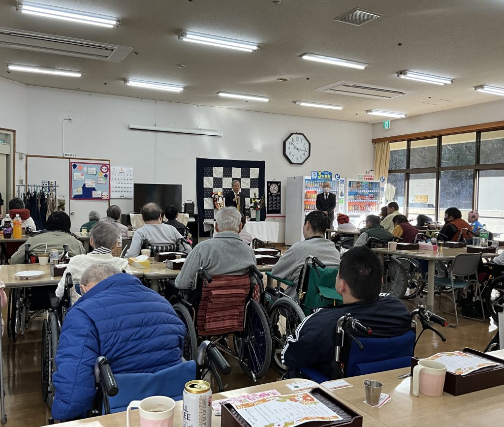 理事長からの新年の挨拶では、法人としての今後の取り組みや目指す方向性、また一年を通した抱負についてお話がありました。利用者の皆さんは、理事長の言葉一つひとつに耳を傾け、真剣な表情で聞いておられました。